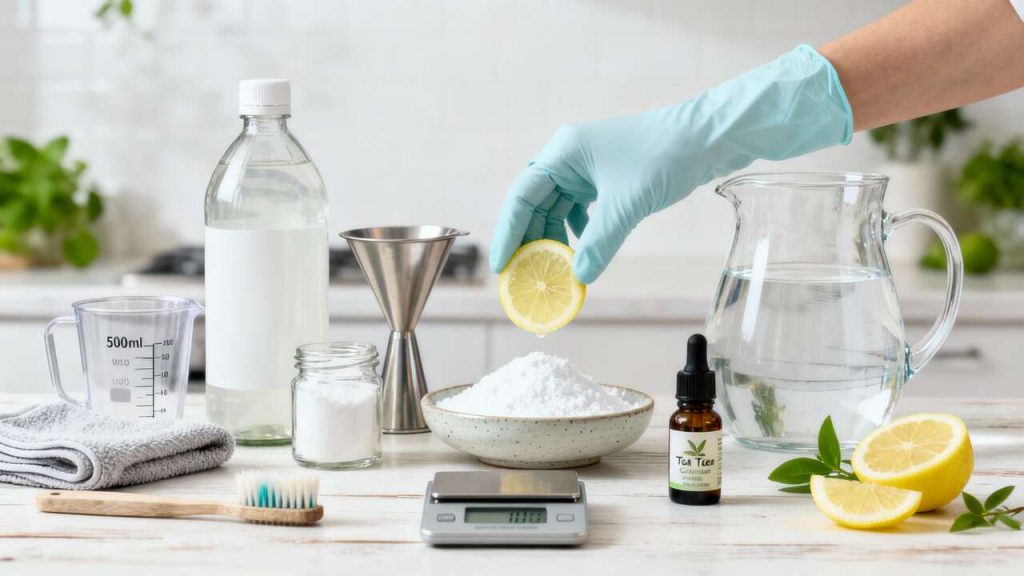 La sicurezza prima di tutto: indossate i vostri guanti, gli occhiali e la mascherina. La vostra postazione di lavoro deve essere pulita e ben ventilata. Posizionate la vostra bottiglia di vetro vuota e, usando l’imbuto, versate con cautela i 300 ml di aceto di alcol bianco. L’aceto è un formidabile alleato naturale: grazie alla sua acidità, svolge un’azione disinfettante, sgrassante e anticalcare.